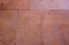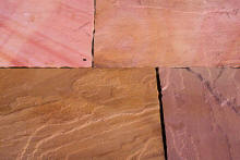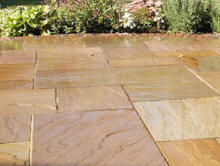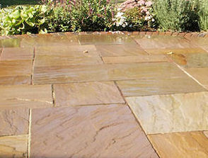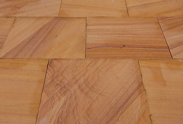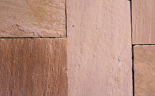A Quartzitic sandstone with Pale buff and orange tones with a small percentage of fossil markings, a natural cleft surface with hand chiselled edges and available in the following sizes.