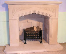 A Fine example of a Tudor arched fire surround with back panels,  shown here in a composite Bathstone finish.
